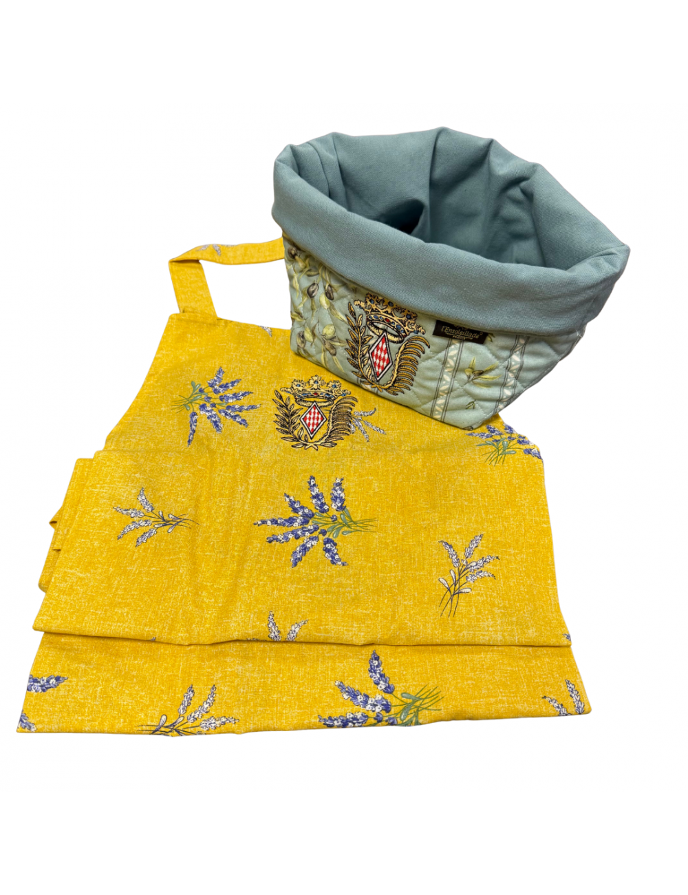 Pour celles et ceux qui aiment cuisiner et recevoir avec élégance, la Fédération des Sites Historiques Grimaldi de Monaco propose un ensemble composé d’un tablier de cuisine et d’une corbeille matelassée aux motifs provençaux. Le tablier, élégant et résistant, protège des éclaboussures tout en offrant une poche brodée du blason de la Fédération. La corbeille, assortie et ornée du même motif, est idéale pour présenter fruits, pains ou biscuits. Ensemble, ces deux pièces allient savoir-faire artisanal et charme du sud pour embellir vos instants gourmands.